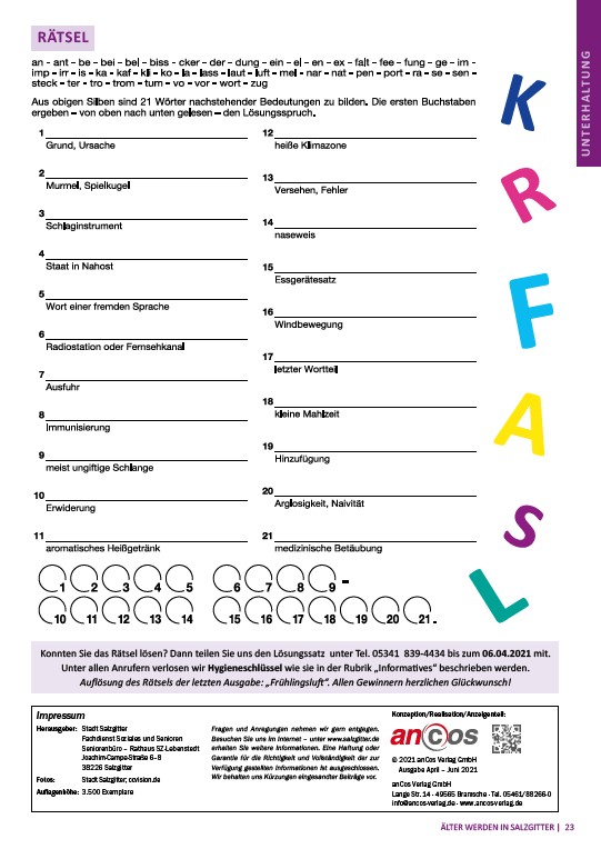 Konnten Sie das Rätsel lösen? Dann teilen Sie uns den Lösungssatz unter Tel. 05341 839-4434 bis zum 06.04.2021 mit.